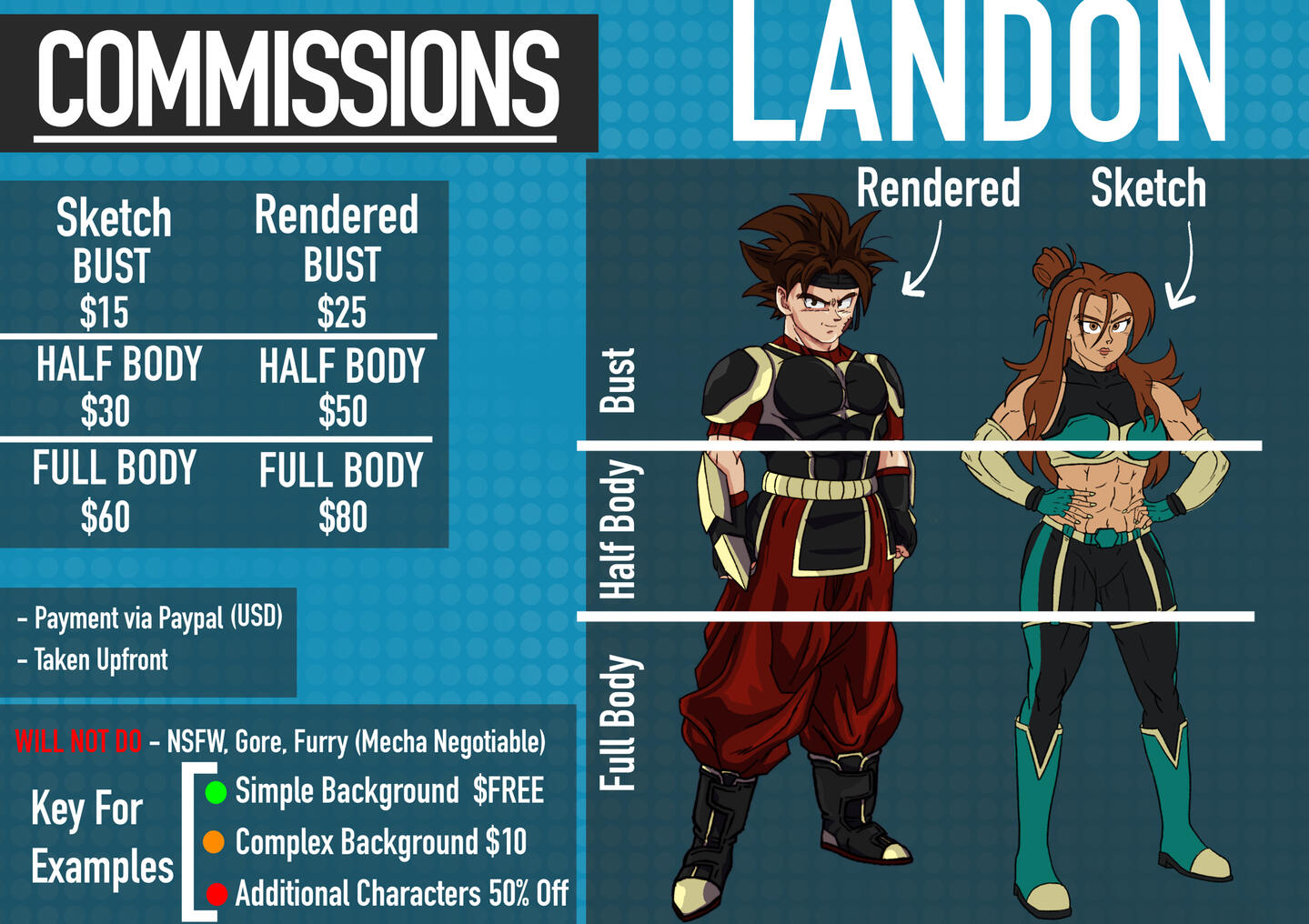 All pricings listed in the image below are for personal orders onlyAll my pricing is in USDWait time for personal orders is typically 1-2 months, depending on my work and college schedules, but if special arrangements need to be made, eg. the commission is for a birthday soon, negotiations can be made.My typical pricing structure as far as typical circumstances regarding extra charracters and effects have two belows below the basic infoFor commissions or other professional works the base price is typically $100 flat, and additional negotiation for pricing and production window will be done via DM on platform of preference or my Email [email protected]